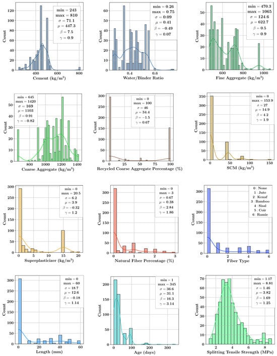 The dataset consisting of 482 data points was collected from the literature []. The input features of this dataset are the amounts of cement, fine aggregate, coarse aggregate, superplasticizer, supplementary cementitious materials (SCM), such as fly ash and silica fume, water-to-binder ratio, percentages of recycled coarse aggregate and natural fiber, the type and length of fiber and age of concrete, whereas the output feature is the splitting tensile strength of concrete. The distributions of each one of these features are shown in Figure 2 in histogram format. Each histogram plot contains a kernel density estimator function in addition to the minimum and maximum values of the feature, the standard deviation (), the mean value (), kurtosis () and skewness () values.