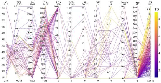 The ranges of each input and output feature are also presented in Figure 3, in a parallel coordinates plot. In Figure 3, each data point is represented by a line connecting the corresponding values of the input features with the corresponding output feature. The lines are also colored with respect to the corresponding tensile strength value. As the tensile strength values increase, the line color of the data points changes from tones of purple to tones of yellow. In Figure 3, FT, TS, SP, NF, C, WB, FA, CA and RCA stand for the fiber type, splitting tensile strength, superplasticizer amount, natural fiber percentage, cement amount, water-to-binder ratio, fine aggregate amount, coarse aggregate amount and the recycled coarse aggregate percentage, respectively. The parallel coordinates plot in Figure 3 also presents an alternative visualization for the distribution of the different features. As an example, it can be observed that, data points with fiber types 6 and 5 corresponding to coir and ramie fibers result in higher tensile strength.