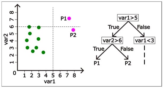 The isolation forest algorithm is based on separating each data point using binary decision trees with the goal of identifying anomalous data points. The decision trees used for this purpose consist of nodes that include conditions about the values of different features of the data. Each node separates the dataset into two sections. One of these sections includes those data points that fulfill the condition of the node and the other section includes those data points that do not fulfill the condition. The procedure is repeated with different conditions on the feature values until one of the sections contains only one isolated data point. Since anomalous data points tend to be farther away from the rest of the points in the dataset with respect to distance metrics such as the Euclidean distance, it takes on average a smaller number of node branching to isolate the anomalous points. This concept is further illustrated on a dataset consisting of 2-dimensional data points in Figure 4.