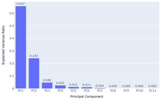 The performance of a predictive machine learning model can be significantly altered due to outliers in the dataset. Therefore, prior to training the predictive models, the outliers were detected using the isolation forest algorithm and principal component analysis. The isolation forest algorithm was used to determine the indices of the data points that were potentially anomalous. Afterwards, the dataset was mapped into two dimensions using the first two principal components of the dataset in order to facilitate the visualization of the data points. The first two principal components were found to capture 90% of the variance in the dataset. The contribution of each principal component to explain the total variance in the dataset is shown in Figure 6. From Figure 6, it can be observed that the principal components with index 7, 8, 9, 10 and 11 contain near zero information about the variance in the dataset.