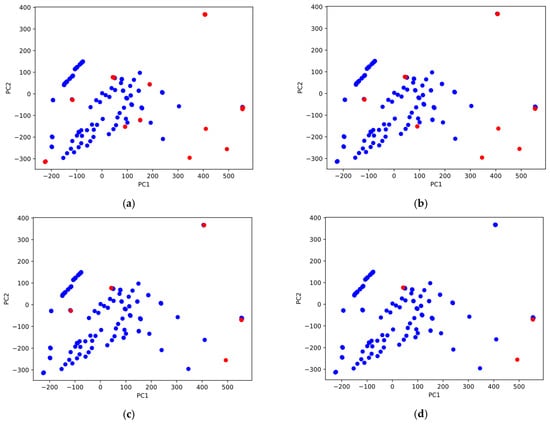 Figure 7 shows the distribution of the data points with respect to their first and second principal components. In Figure 7, the inlier data points are colored in blue whereas the outlier data points are colored in red. The data points were classified as inliers and outliers based on the results of the isolation forest algorithm. Figure 7 shows the outlier data points for four different levels of the contamination coefficient which determines the number of data points deemed as outliers. The largest number of outliers can be observed in Figure 7a for a contamination of 0.1 which corresponds to 10% of the data points being deemed as outliers.