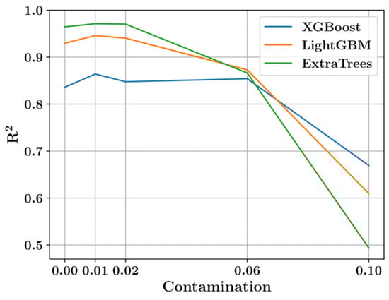 In this section, the predictions of three predictive models are presented. Before training the models, 1% of the data points were removed as outliers. This percentage was selected in order to maximize the model performances. Figure 8 shows the variation in the predictive performances with respect to the amount of removed outliers represented by the contamination variable. In Figure 8, a contamination of 0.01 corresponds to 1% of the data points being removed from the dataset as outliers according to the isolation forest methodology. For each level of contamination in Figure 8, the inlier points of the dataset were randomly split into a training and test set in an 80% to 20% ratio. The model performances were measured on the test set after training the models on the training set. The average model performances resulting from 50 different random splits are presented in Figure 8. For all models in Figure 8, the contamination level of 0.01 delivered the best model performance. Therefore, this level of contamination was adopted for the rest of the analysis in this paper. It should be noted that increasing the contamination level beyond 0.02 is found to adversely affect the predictions.