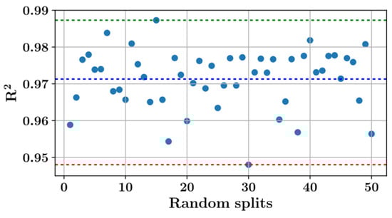 Figure 8 shows that, on average, the best model performance could be obtained from the extra trees regressor. The fluctuation in the extra trees model performance for 50 different random splits of the inlier dataset can be seen in Figure 9. According to Figure 9, the extra trees model performance fluctuated between 0.948 and 0.987 on the test set with an average value of 0.971. In Figure 9, the maximum, minimum and average values of the R2 scores are shown with green, red and blue dashed lines, respectively.