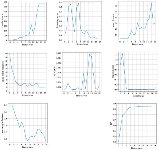 The hyperparameters of the LightGBM, extra trees and XGBoost models were optimized using the blended search strategy (BlendSearch) and cost-related frugal optimization (CFO) algorithm implemented in the FLAML package. The steps of the optimization are presented in Figure 10 for the hyperparameters of the LightGBM model. The optimized values of the hyperparameters for all three predictive models and the performances of the predictive models are listed in Table 1 and Table 2, respectively.