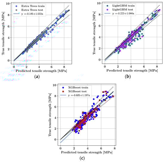 For each predictive model, the predictions on the training and test set are visualized in Figure 11 for the random split corresponding to the best model performance. The predictions on the training and test sets are plotted in different colors. Furthermore, the ±10% deviation lines from a perfect prediction are plotted as dashed lines. In addition, for each predictive model, a linear curve was fitted which approximates the relationship between the predicted and true tensile strength values. In addition to the R2 score, the slope of the fitted curve can be used as an indicator of predictive performance such that slopes closer to 1 indicate more accurate prediction.