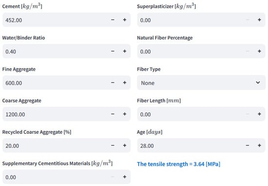 In order to make the developed models available, an online graphical user interface was developed using the Streamlit platform. The online graphical user interface can be accessed through the link https://splitting-tensile-composite.streamlit.app (accessed on 6 January 2025). A screenshot of this user interface can be seen in Figure 12. The user interface is responsive to user input such that every time a new input feature value is entered by the user, the output value is automatically updated. The updated tensile strength value is then printed in the lower right portion of the screen in blue color. The input boxes only accept input feature values in certain predefined ranges based on the dataset on which the predictive model has been trained. In this sense, the predictive model is limited by the upper and lower bounds of the feature values included in the training set. The user interface is based on the extra trees regressor which delivered the best performance in terms of the coefficient of determination (R2 score).