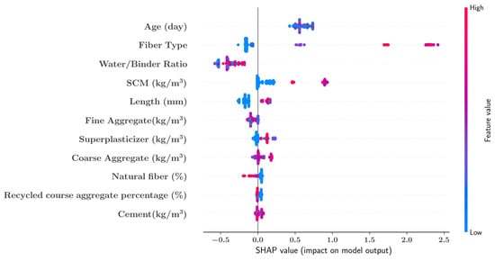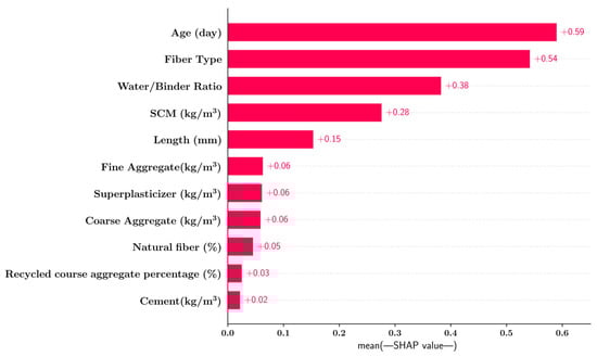 In this section, the impacts of the input features on the extra trees model predictions were quantified using a feature importance bar plot (Figure 13), a summary plot (Figure 14) and a heatmap plot (Figure 15) generated through the SHAP algorithm. Each one of these plots indicated that the age of the specimen, fiber type and water-to-binder ratio had the greatest impact on the predictive model output. The bar plot in Figure 13 is generated by calculating the SHAP value of each input feature and taking the mean absolute value of these SHAP values over the entire dataset. Figure 13 shows that the amount of cement, the percentage of the recycled coarse aggregate and the natural fiber percentage had the least impact on the model predictions.