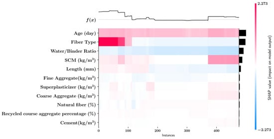 The SHAP heatmap plot in Figure 15 presents an alternative visualization of the feature impacts where each data point is represented with a vertical line colored according to the SHAP value of a feature. High SHAP values indicating high impact on the model output are color-coded in tones of red whereas low SHAP values are color-coded in blue tones. The heatmap plot also includes the predicted tensile strength values for each data point as the function at the upper side of the plot. Furthermore, feature importances are included at the right-hand side of the plot as black horizontal bars. It can be observed that features with the lowest impact, such as cement amount and recycled course aggregate percentage, are colored in tones of white since these features are associated with low SHAP values.