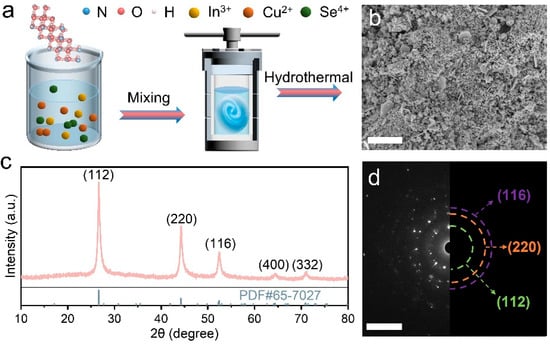 Preparation of CIS. (a) Schematic of the preparation process; (b) SEM, scale bar: 2 μm; (c) XRD pattern; (d) diffraction pattern from the selected area, scale bar: 10 nm.