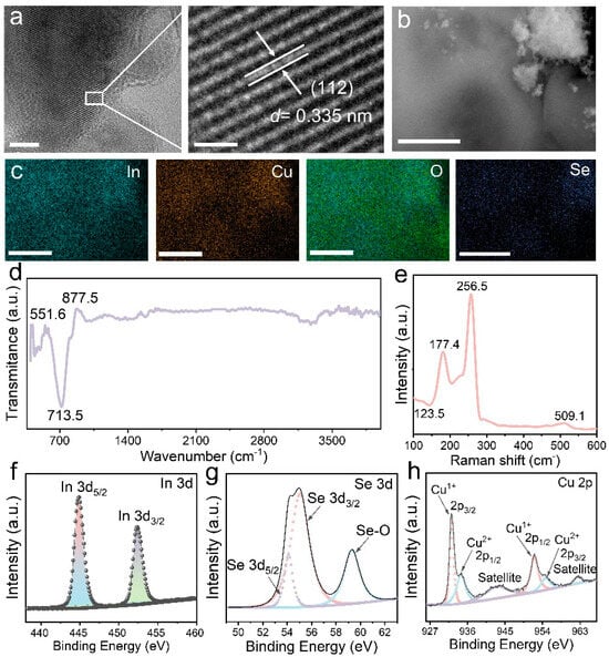 Characterization of CIS. (a) TEM, scale bar: 5 nm and HR-TEM, scale bar: 1 nm; (b,c) EDS elemental maps, scale bar: 2 μm; (d) FT-IR; (e) Raman patterns of CIS. High-resolution XPS spectra of (f) In 3d, (g) Se 3d and (h) Cu 2P for CIS.