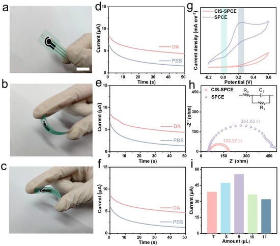 Comparison of electrochemical properties of bare SPCE and CIS-SPCE. (a) Before bending, (b) outward bending, (c) inward bending and (d–f) the corresponding amperometric responses of CIS-SPCE in 0.1 M PBS with and without 0.3 mM DA, respectively. (g) CV and (h) EIS curves of bare SPCE and CIS-modified SPCE in 0.1 M KCl solution containing 1.0 mM K3Fe(CN)6. (i) DPV responses of CIS-SPCE to different electrocatalytic dosages in 0.5 mM DA.