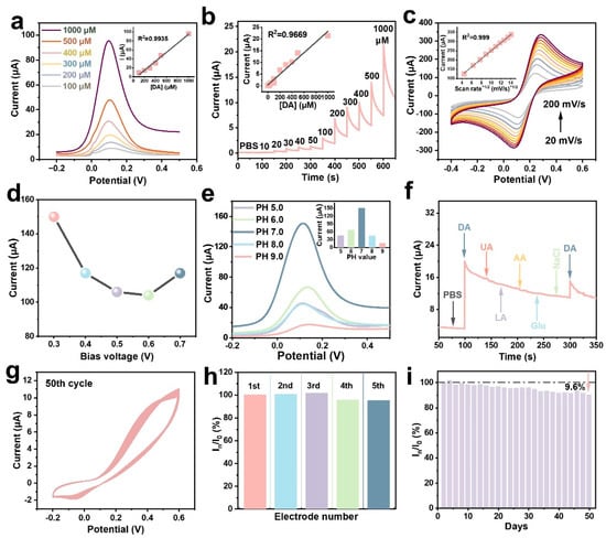 The electrode reaction kinetics of DA for CIS-SPCE were recorded through CV at various scan rates from 20 to 200 mV/s. As depicted in Figure 4c, two clear and symmetrical redox peaks can be observed, indicating the satisfactory electrochemical redox activity of CIS-SPCE on DA. The peak current increases with increasing scan rate, and is linearly related to the square root of the scan rate, implying a diffusion-controlled process [46]. Subsequently, the effects of applied potential (Figure 4d) and PH value (Figure 4e) on the sensing activity of CIS-SPCE were explored. It can be observed that the current response first decreased and then increased gradually as the bias varied from 0.3 to 0.7 V, reaching the maximum current at 0.3 V and the minimum at 0.6 V, respectively. To this end, the test current was selected at 0.3 V.