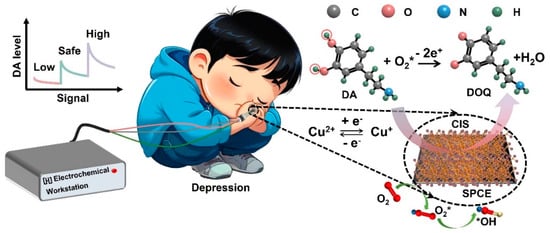 The superior catalytic capabilities of CIS-SPCE toward DA determination originate from the following aspects: (i) the admirable natural properties of the CIS catalyst, including high conductivity (from the EIS results), large specific surface area (from SEM) and good stability (Figure 4g,i); and (ii) the valence transitions between Cu2+ and Cu1+ ions involving the electron transfer (from XPS results) and the yield of abundant O2* (Figure 5). Owing to the abovementioned advantages, numerous DA cations can be effectively identified and adsorbed on the surface of CIS-SPCE, resulting in an anodic peak and allowing the use of the peak current to evaluate the DA levels.