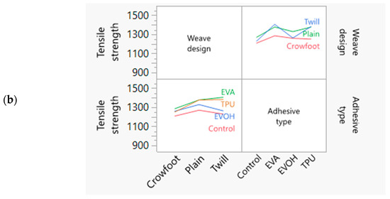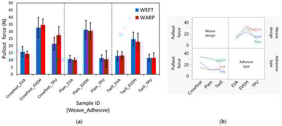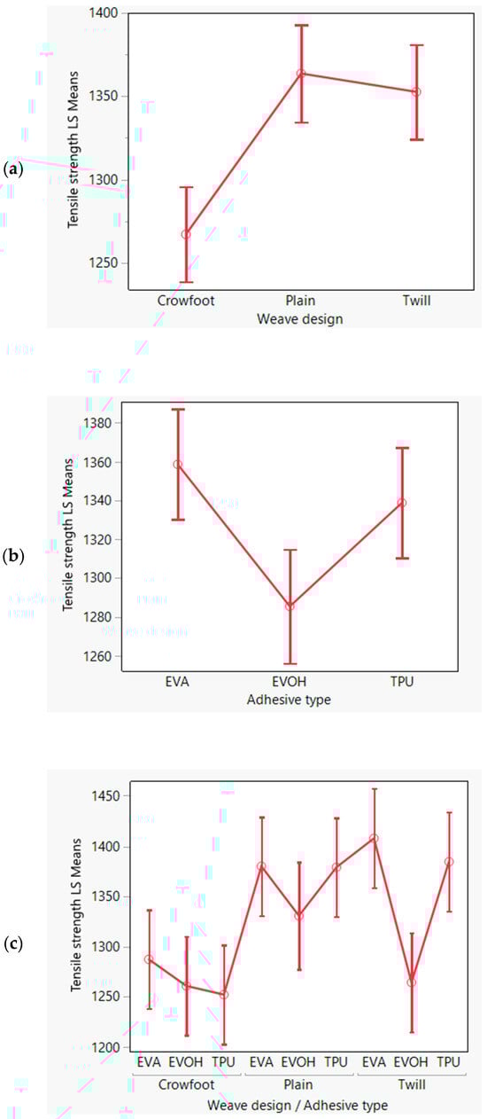 14]. This can be attributed to the longer floats and fewer interlacings in twill and satin weaves, which provide more contact area for the adhesive, enhancing bonding strength. For example, Malengier et al. demonstrated that twill fabric offers better adhesion for PLA filament compared to plain weave [