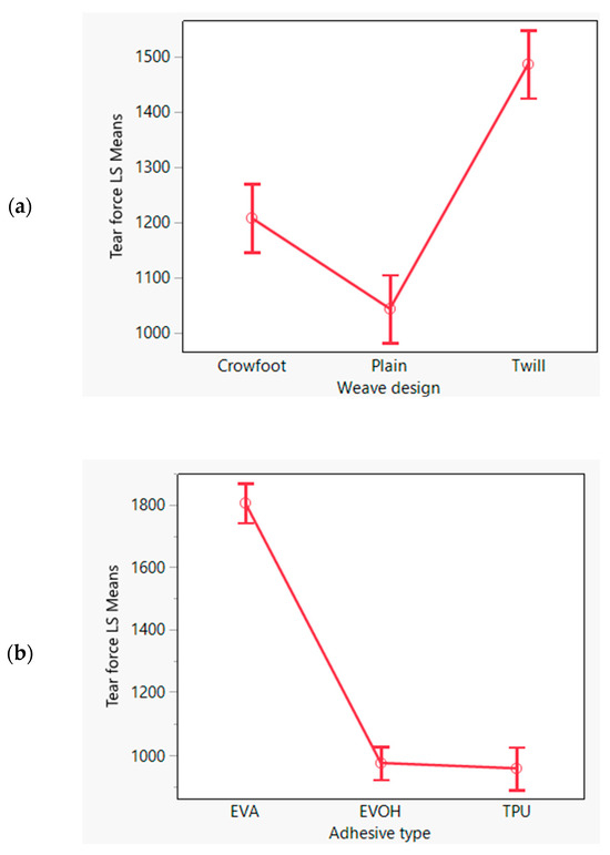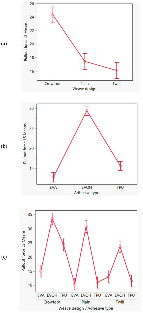 This study demonstrates that weave design and adhesive type significantly influence the mechanical performance of laminated fabrics, particularly in yarn pullout force, tear strength, and tensile strength. Stronger adhesion increases pullout resistance but reduces tear strength by restricting yarn mobility, while weaker adhesion allows for higher tear strength due to increased yarn slippage. The SEM analysis confirmed these trends, showing that in high-adhesion laminates, adhesive fracture occurs during yarn extraction, while in low-adhesion laminates, yarns pull out with minimal resistance, leaving the adhesive encapsulation intact. The findings emphasize the trade-offs between adhesion strength and fabric flexibility, which are critical in optimizing laminated fabric performance for specific applications. The statistical analysis revealed that weave design plays a dominant role in adhesion performance, with crowfoot exhibiting the highest pullout force but lower tear resistance due to its higher adhesive penetration. Twill weave showed the best tear resistance, benefiting from moderate yarn mobility and load-sharing effects, while plain weave had the lowest tear strength due to its high interlacing frequency. Additionally, adhesive selection was found to be statistically significant in both tear and tensile tests, with TPU and EVA improving tensile performance, whereas EVOH provided the highest adhesion but reduced tear strength. The absence of a significant weave–adhesive interaction effect on tensile strength suggests that both factors influence fabric performance independently rather than synergistically.