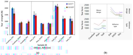 25]. Futhermore, Haddad and Black found that 2/2 twill had the same peel strength in both the warp and weft directions but 1 × 3 twill had higher peel strength in the direction where the filling yarns were exposed because the filling yarns were free of sizing material and core spun to accentuate adhesion [