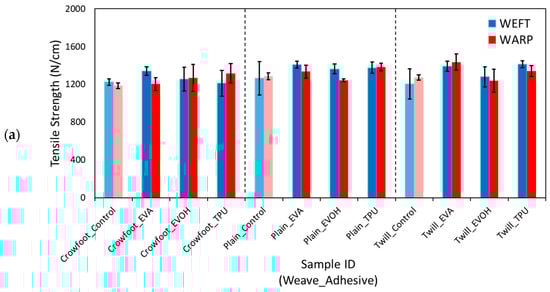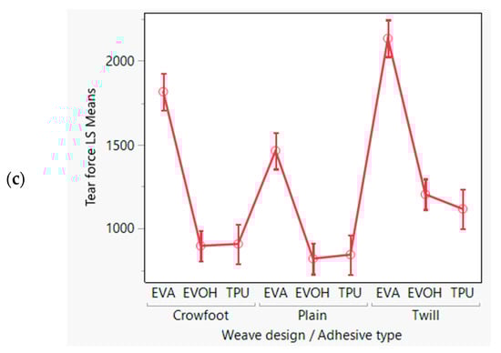 Overall, the results highlight the importance of balancing adhesion and fabric structure when designing fiber-reinforced laminates for different engineering applications. For high-adhesion applications, such as LTA envelopes and inflatable systems, EVOH combined with crowfoot weave ensures strong interfacial bonding. However, for tear-critical applications, lower adhesion adhesives like EVA, paired with plain or twill weaves, improve energy dissipation and prevent premature failure. Future work should explore the long-term durability of these laminates under cyclic loading and environmental exposure, as well as alternative surface treatments to enhance adhesion without compromising tear performance. Future studies should explore other fabric structures, such as mesh and three-dimensional woven designs, and their bonding interactions with adhesives, particularly in high-stress environments as well as other high-performance fibers like UHMWPE, Zylon, and carbon fibers. Additionally, a comprehensive evaluation of mechanical properties, including impact resistance, bending, and durability, will further clarify the practical application potential of these laminates. Research on alternative adhesive formulations, surface treatments, and nanomaterial enhancements could help achieve both strong adhesion and improved tear resistance. Examining abrasion resistance, impact energy absorption, and environmental durability will also expand the applicability of fiber-reinforced laminates in high-performance industries.