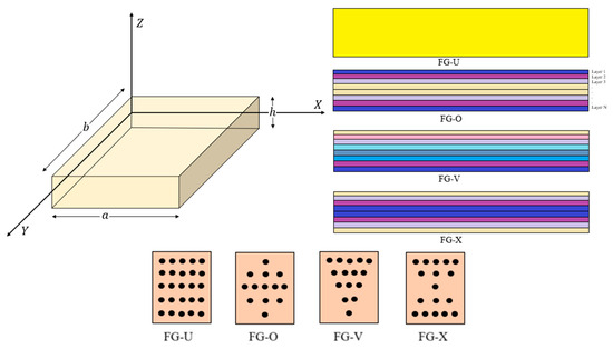 The hybrid reinforced laminated composite plate is assumed to comprise several layers in which the concentration of GPLs and fibers varies regularly. Thus, the continuous variation of the GPs and fibers along the thickness are called functionally graded hybrid reinforced laminated composite (FGHRLC) plates. Consider a FGHRLC plate with dimensions along the X- and Y-axis, respectively, with thickness equal to units. The plate lies in the X-Y plane with the thickness along the Z-axis (Figure 1). Shape factors, i.e., and govern the content of GPL and fibers gradient along the thickness direction of the plate. The volume fraction of the GPLs and fibers for the k-th layer can be worked out as