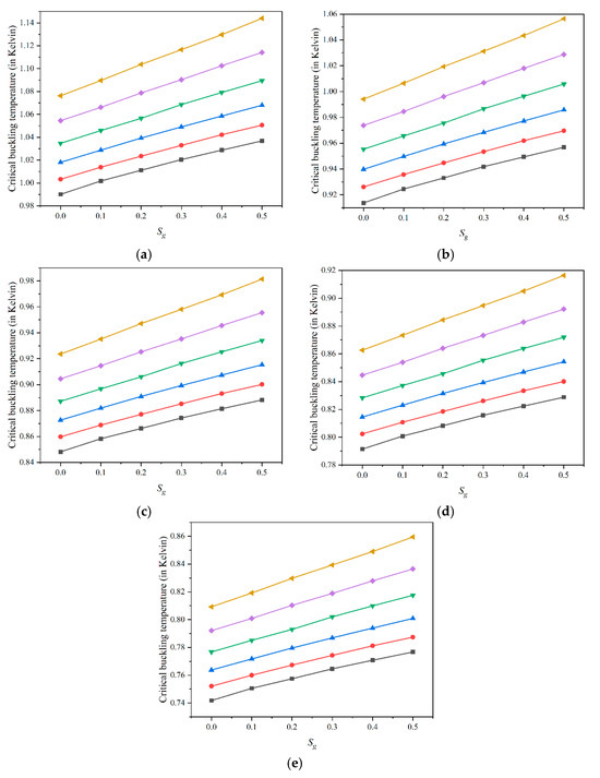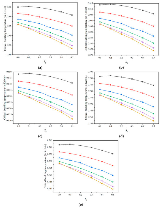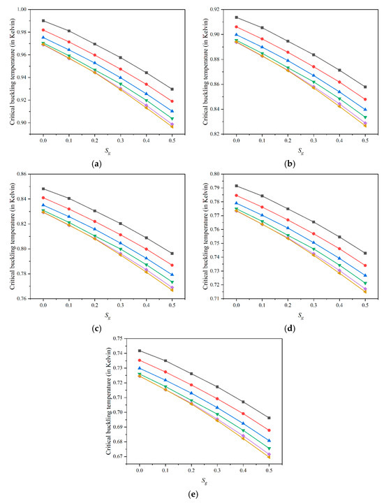 Figure 2 shows the variation of critical buckling temperature for the SSSS plate with different values of and for FG-X plate. As the temperature increases (from Figure 2a at 300 K to Figure 2e at 400 K), the critical buckling temperature generally decreases for all values of Sf and Sg. This decreasing trend with temperature indicates thermal softening effects, where the material’s stiffness reduces with higher thermal exposure, leading to a lower critical buckling threshold. At each temperature level, the critical buckling temperature increases with an increase in Sf from 0 to 0.5. A higher Sf value, which corresponds to a more concentrated fiber distribution, enhances the plate’s stiffness and stability, leading to higher critical buckling temperatures. Within each line corresponding to a specific Sf, the critical buckling temperature also increases as Sg increases from 0 to 0.5. A higher Sg value implies a greater distribution concentration of graphene platelets, which reinforces the plate’s structural integrity and stability, thereby increasing its resistance to buckling under thermal loads. With an increase in temperature of 25 K, about 15% increase in critical buckling temperature is observed in all of the cases.