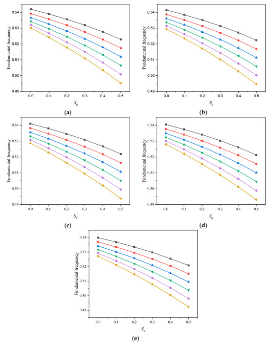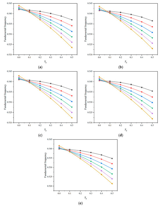 Figure 7 shows the variation of fundamental frequency for the SSSS plate with different values of and for FG-O plate. The fundamental frequency decreases as temperature increases. In each case, as Sf increases from 0 to 0.5, the fundamental frequency decreases. Lower values of Sf result in higher frequencies, suggesting that a concentrated distribution of fibers enhances the stiffness and stability of the plate, thereby increasing the fundamental frequency. Within each line corresponding to a specific Sf value, the fundamental frequency decreases as Sg increases from 0 to 0.5. Lower Sg values are associated with higher fundamental frequencies, indicating that a more concentrated distribution of graphene platelets also contributes to increased stiffness and vibrational stability. The highest fundamental frequencies are observed when both Sf and Sg are at their minimum values, highlighting those concentrated distributions of fibers and graphene platelets enhance the plate’s stiffness and fundamental frequency. Conversely, the lowest frequencies are found when both Sf and Sg are at their maximum values, indicating reduced vibrational stability due to a more dispersed distribution of reinforcements.