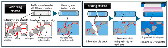 This research aims to (1) establish a manufacturing method for double-layered porcelain with controlled porosity gradients (60–70% inner layer, 30% outer layer); (2) successfully incorporate UV-curable resin for self-healing functionality; and (3) evaluate the mechanical properties of the healed ceramic. To achieve these objectives, we investigated the relationship between UV exposure time and maximum post-healing stress (bending strength), correlating this with UV resin curing rates. Pore size distribution was characterized using mercury porosimetry, while scanning electron microscopy (SEM) with energy-dispersive X-ray spectroscopy (EDS) and FT-IR spectroscopy were employed to confirm UV resin coverage of fracture surfaces.