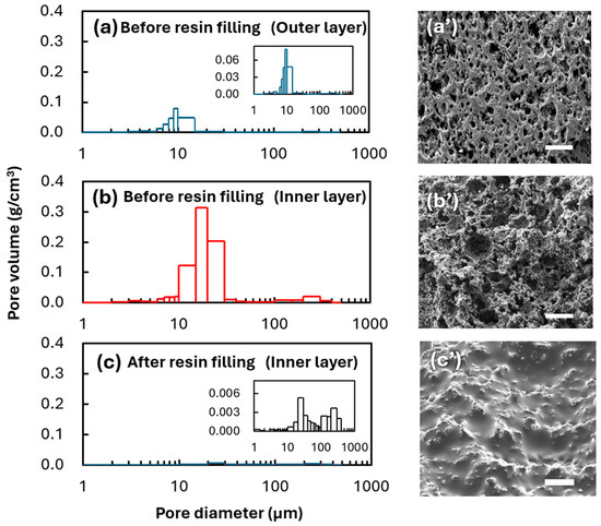 Mercury porosimetry measurements of pore size distributions (left) with corresponding SEM micrographs (right, scale bar = 10 µm) for (a,a’) outer layer before resin filling, with inset showing magnified view of the pore volume distribution; (b,b’) inner layer before resin filling; and (c,c’) inner layer after UV-curing resin filling, with inset showing magnified view of the pore volume distribution. Both insets display the same data at smaller pore volume ranges.