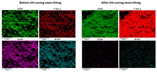 Figure 4 shows the results of the elemental mapping before and after UV-curable resin filling. In the pre-filling samples (Figure 4, left column), Si and Al constituents of the porcelain were widely distributed, while O and C signals were limited. In contrast, after filling (Figure 4, right column), O and C were observed to spread throughout the sample. This indicates the penetration of acrylate-based resin, the main component of the UV-curable resin, confirming that the porcelain’s pores were filled with resin. Furthermore, the significant reduction in Si and Al signals after filling suggests that detection became difficult due to the resin coverage. This implies that the resin penetrated not only near the surface but deep into the internal pores, consistent with SEM observations (Figure 3, right). The EDS elemental mapping clearly demonstrates that the UV-curable resin not only penetrated the porous layer but spread uniformly within the pores, forming good interfaces with the porcelain components. These results confirm that vacuum filling effectively distributes UV-curable resin throughout the ceramic interior.