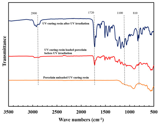 FT-IR spectroscopy was used primarily to evaluate whether UV-curable resin uniformly penetrated the porcelain matrix and to confirm the basic polymerization progress (Figure 5). Three samples were measured, namely (i) UV-curable resin without porcelain, (ii) porcelain filled with UV-curable resin before UV irradiation, and (iii) porcelain filled with UV-curable resin after UV irradiation. An absorption at around 2900 cm−1, attributed to C–H stretching vibrations, served as an indicator of the resin’s presence within the porcelain. Additionally, a strong peak at 1720 cm−1, corresponding to the carbonyl group (C=O) of acrylate resin, suggested that the resin maintained its chemical characteristics after infiltration [50,51]. Furthermore, peaks around 1100 cm−1 were observed, potentially attributable to C–O–C stretching vibrations. Some references associate these bands with ether or epoxy-related structures [52], but in our study, we have not acquired sufficient data to clarify whether any epoxy functionality in the resin participates in the UV-induced polymerization. Notably, the C=C bending vibration peak clearly visible at around 810 cm−1 in the pre-UV irradiation resin sample significantly decreased after UV irradiation. This peak reduction indicates consumption of the acrylate vinyl groups and serves as an important indicator of radical polymerization progression [53]. Subtle shifts in the C=O stretching and C–O–C stretching vibration peaks after UV irradiation may reflect minor molecular structural changes upon curing.