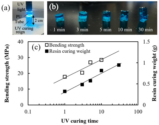 (a) Schematic and photographic illustration of the UV-curing setup, showing the polyurethane tube containing resin and the UV irradiation configuration. (b) Visual appearance of samples cured under various UV irradiation times (1–30 min), demonstrating progressive changes in cured volume. (c) Relationship between UV curing time and both bending strength (□, left axis) and cured resin weight (■, right axis), plotted on a logarithmic time scale with trend lines indicating approximate data fitting.