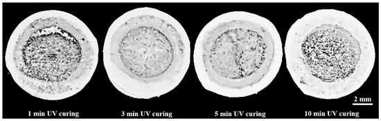 To evaluate UV-curable resin polymerization behavior, resin curing experiments were conducted in polyurethane tubes using the setup shown in Figure 7a. UV light was irradiated from above with a 2 cm UV curing region. Figure 7b shows the appearance of cured resin under different UV exposure times (1–30 min). Visual inspection confirmed increased cured resin volume with longer exposure times. Figure 7c shows the relationship between UV exposure time and both cured resin weight and bending strength. With the horizontal axis displayed on a logarithmic scale, both parameters showed linear increasing trends with exposure time. Cured resin weight increased from approximately 0.3 g at 1 min of exposure to about 1.0 g at 30 min. Similarly, bending strength increased from approximately 15 MPa at 1 min of exposure to about 30 MPa at 30 min. This trend correlates with increased cured resin weight, suggesting that extended UV exposure enables polymerization to progress deeper, leading to improved mechanical strength. Furthermore, the continued increase in cured weight beyond 10 min indicates that complete resin curing requires substantial time. These results align with the healing efficiency improvement trends shown in Section 3.4, confirming that extended UV exposure promotes complete resin curing and enhances post-healing mechanical properties.