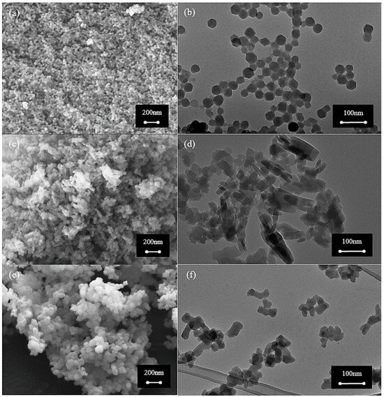 FESEM and TEM images of (a,b) ZIF-8, (c,d) NH2-MIL-53(Al), and, (e,f) NH2-UiO-66(Zr).