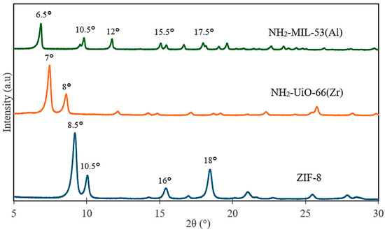The XRD patterns of the synthesized catalysts are shown in Figure 3. For ZIF-8, several characteristic peaks were identified at 2θ values of 8.5°, 10.5°, 16°, and 18°. In addition, the main peak found at the 2θ value of 8.5° was reported to contribute to the stable rhombic dodecahedron shape observed from Figure 2a [12]. Meanwhile, the XRD pattern obtained for the synthesized NH2-UiO-66(Zr) showed good agreement with the literature in regard to the obtained peaks at around 2θ values of 7° and 8° [13,16,17]. The XRD characteristic peaks at 2θ values of 6.5°, 10.5°, 12°, 15.5°, and 17.5° were obtained for NH2-MIL-53(Al) samples synthesized in this work, which corresponded to the NH2-MIL-53(Al) structure, as reported in the literature [18]. Generally, the XRD results obtained for all samples confirmed the successful synthesis of the samples.