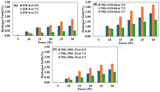 Figure 4 shows the results for the H2 yield obtained by using different MOF catalysts. Generally, it can be observed that with increasing input power, the H2 yield for all MOF catalysts at varying CO2:CH4 molar ratios showed an increasing trend. This was likely due to the increase in plasma power and density with increasing input power, which led to improved electron collision and greater CO2 and CH4 conversions, therefore increasing the H2 yield with increasing input power [19]. In terms of the CO2:CH4 molar ratio, 7:3 was recorded to produce a greater H2 yield, compared to CO2:CH4 molar ratios of 5:5 and 3:7. It could be due to the higher CO2 feed concentration, which improved the catalytic performance of MOF catalysts and allowed for greater interaction between the MOF and plasma irradiation [20].