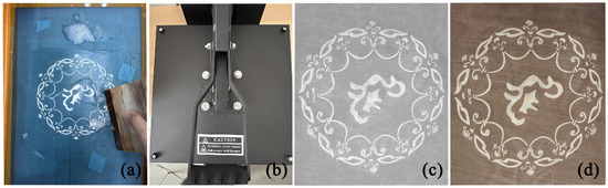 Alkali gel degumming and printing process. (a) Coating alkali gel for printing. (b) Hot pressing using a flatbed hot press machine. (c) Plain-colored pattern after cleaning residual gel. (d) Pattern after dyeing.