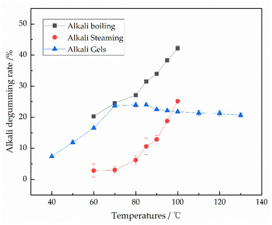 As shown in Figure 3, whether using alkali boiling or alkali steaming degumming, the degumming rate continuously increases with rising temperature. However, during the alkali gel degumming process, when the hot pressing temperature exceeds 90 °C, the degumming rate of Silk Gauze decreases, which is significantly different from the degumming methods of alkali boiling and alkali steaming. During alkali steaming, the process relies on the gradual release of the alkali agent in the paste by the water molecules in the steam. When the temperature does not reach the boiling point of water, the amount of steam is limited, causing the degumming rate to increase slowly and never exceed 20%. At a temperature of 100 °C and steaming for 2 h, the degumming rate remains around 25%. In the alkali boiling degumming process, the sericin fully contacts the alkaline water solution, which better surrounds and removes the sericin from the surface of the silk, making alkali boiling degumming rapid and effective. At a boiling temperature of 80 °C for 30 min, the degumming rate reaches around 27%, significantly higher than that of alkali steaming [20].