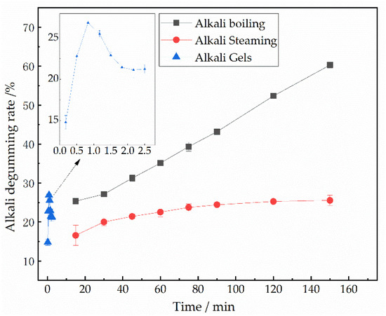 This trend of the degumming rate first increasing to a peak and then decreasing with time is different from the trends observed in the alkaline boiling and alkaline steaming degumming processes, which are displayed in Figure 4. During the alkaline boiling degumming process, at 80 °C, the degumming rate reaches 25.34% at 15 min and further increases to 27.12% at 30 min, indicating complete degumming. When the boiling time extends to 2 h, the fabric loses more than 50% of its weight, and the fibroin starts to degrade. In the alkaline steaming degumming process, at 100 °C, the degumming rate increases from 16.54% at 15 min to a stable rate of around 25% at 2 h. Although the degumming rate shows a slow increase with time, it does not decrease [21]. The differing trends in the degumming rate are significantly influenced by the change in water content during the degumming process with alkaline gel.