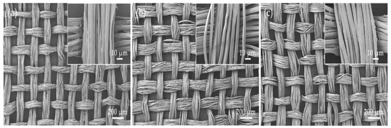 It can be observed that there are no significant differences in the surface morphology of Silk Gauze under the three degumming methods. The silk fibers achieved good degumming, with the fibroin exhibiting fine longitudinal stripes due to the microfibril structure. The fiber surfaces are smooth and free of sericin attachment, and the fabric structure appears fluffy [24].