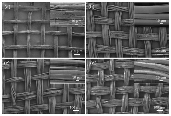 The study utilized SEM to further observe the surface morphology and structure of Silk Gauze under different process conditions. Figure 6a shows the undegummed Silk Gauze, where the surface of the raw silk fibers is rough, and sericin tightly bonds multiple fibroin strands together [23], with significant gaps between the warp and weft yarns. Figure 6b presents the surface morphology of Silk Gauze after high-temperature alkaline boiling treatment (complete degumming conditions: saturated lime water, bath ratio 1:80, temperature 80 °C, time 30 min). Figure 6c shows the surface morphology of Silk Gauze under conditions of lime-alkaline-paste–steam synergistic treatment (saturated lime water alkaline paste, steam temperature 100 °C, steam time 120 min). Figure 6d depicts the surface morphology of Silk Gauze under alkali gel degumming treatment (sodium hydroxide concentration 8 g/L, hot pressing temperature 80 °C, hot pressing time 50 s).