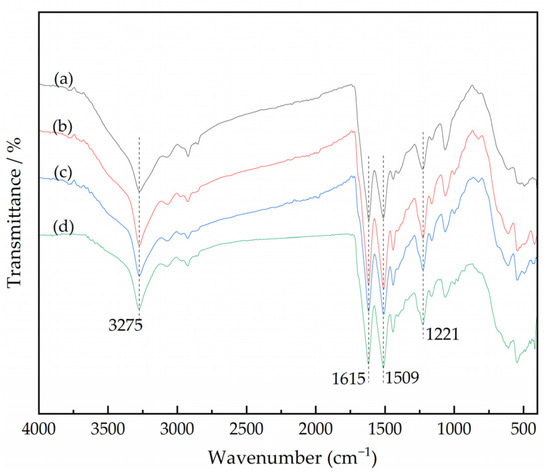 Infrared spectra of silk gauze under different alkaline degumming processes. (a) Undegummed. (b) Alkaline boiling degumming. (c) Alkaline steaming degumming. (d) Alkaline gel degumming.