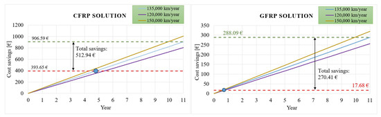 - The carbon fibre solution offers instead greater long-term economic savings (equal to 512.94 EUR) by the end of the vehicle’s useful life than the glass fibre one (equal to EUR 270.41). This is achieved due to a weight reduction of 55% (compared to the original configuration) for the CFRP solution, while a minor weight reduction of 18% for the GFRP configuration was evaluated.