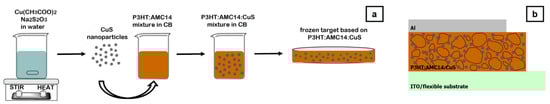 The organic (P3HT:AMC14) and hybrid composite (P3HT:AMC14:CuS) films were deposited by MAPLE using a KrF* excimer laser source (Coherent, CompexPro 205, λ = 248 nm, τFWHM ~25 ns) working at room temperature and the following experimental parameters: 300 mJ/cm2 laser fluence, 20 Hz frequency, 10−4 mbar residual pressure in the deposition chamber, 5 cm target–substrate distance and 25 k laser pulses. More information on the MAPLE technique can be found in the references [40,41]. For a thorough assessment, the layers were deposited on flexible (ITO/PET) and rigid (glass and silicon) substrates in the same deposition cycle being rotated to improve the thickness homogeneity. Both organic materials (P3HT and AMC14) exhibit good solubility in chlorobenzene (CB). Therefore, this chlorinated aromatic compound was used as solvent to obtain the frozen targets (4.5% w/v) used in the MAPLE process. Although P3HT is mainly soluble in chloroform and CB, according to the literature, CB favors the preparation of films with adequate morphology [42]. Another criterion for choosing CB is correlated to the laser wavelength: usually, the laser energy is mostly absorbed by the solvent during the MAPLE procedure [43]. The amount of CuS nanoparticles added to the active layer was selected taking into consideration the very few studies previously reported on the deposition of blend films based on P3HT and metal sulfide nanostructures for photovoltaic applications [20,31,44,45]. Hence, the best device parameters were achieved by adding 1% CuS nanoplates with diameters between 30 and 680 nm in P3HT:PCBM (1:1 weight ratio) [31], 1% FeS2 nanoparticles with sizes between 20 and 30 nm in P3HT [44], 3% CuS nanoparticles with different shapes and sizes in P3HT:PCBM (1:1 weight ratio) [20] or 10% ZnS nanowires with diameters about 10 ± 20 nm and length up to 100 ± 150 nm in P3HT [45]. As a consequence, the frozen targets involved in the MAPLE process were prepared by freezing in liquid nitrogen the mixtures obtained in CB based on P3HT:AMC14 (1:1 weight ratio) or P3HT:AMC14:CuS (1:1:0.1 weight ratio). Further, metallic electrodes (Al, 100 nm) were deposited by thermal vacuum evaporation using a Tecuum AG (Winterthur, Switzerland), VCM600-V3-80 setup (2Å/s deposition rate) on the organic and hybrid MAPLE layers fabricated on ITO/PET flexible substrates. Figure 1 presents the schematic representation of the stages involved in the procedure for getting the MAPLE frozen target (Figure 1a) and the configuration of the developed heterostructures based on hybrid composite layers (Figure 1b).