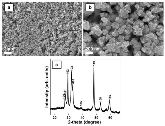 Copper sulfide synthesized by wet chemical precipitation was investigated from morphological and structural point of view. The FESEM images (Figure 2a,b) reveal that the prepared black powder consists in nanoparticles with sizes below 100 nm and agglomerated nanoparticles. The XRD pattern (Figure 2c) shows the main peaks associated with the Miller indexes of the reflecting planes attributed to the CuS hexagonal covellite phase (ICDD 00-006-0464). The crystallite size (D) of the CuS nanoparticles was calculated to be around 23 nm based on Debye–Scherrer formula D = Kλ/βcosθ, where K is the shape factor (0.9), λ is the wavelength of the incident radiation (0.154 nm), β is the full width at half maximum (FWHM) of the most intense diffraction peak, and θ is the Bragg angle.