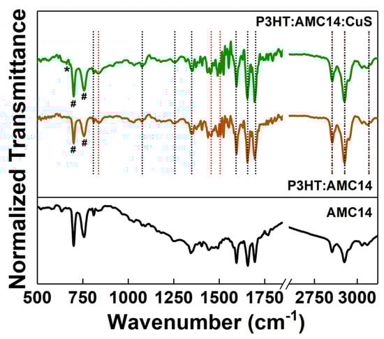 Figure 3. FTIR spectra of the organic and composite layers prepared by MAPLE on silicon substrates. Absorption bands attributed to the P3HT (red vertical dot lines), AMC14 (black vertical dot lines), CuS (*) and CB (#).