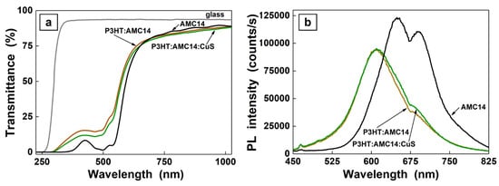 The optical properties of the organic and hybrid composite films deposited by MAPLE were analyzed by UV–Vis and PL (Figure 4). To avoid the influence of the ITO/PET substrate on the optical properties of the MAPLE layers, the measurements were initially carried out on samples prepared on glass (transmission spectra) and silicon (PL spectra) substrates. It can be noted that the shape of the UV–Vis and PL spectra of the organic blend and composite films resembles, most probably due to the smaller amount of CuS nanoparticles. Thus, the UV–Vis spectra of the mixed layers (Figure 4a) are dominated by the characteristic absorption bands of the AMC14. Accordingly, the UV–Vis spectra show the absorption bands due to the 0→0 transition at ~540 nm, 0→1 transition at ~495 nm and 0→2 transition at ~470 nm, which can be correlated with individual molecules and π–π stacking interactions inside the PDI assembly [55,56,57]. Regarding the P3HT, this compound exhibits a large absorption band between 400 nm and 650 nm with two maxima at ~605 nm and ~560 nm [58]. In the UV–Vis spectra of the mixed layers, the P3HT absorption is not observed, most likely being hidden by the strong visible absorption of the AMC14. However, the presence of the P3HT can modify the molecular packing conformation of the PDI compound, resulting in an attenuation and shift towards lower wavelengths of the specific absorption bands of the AMC14. According to the literature, the PDI compounds tend to form aggregates, the process being strongly influenced by the type of organic solvent used in their dissolution [57,59].
