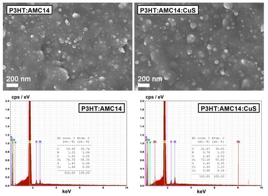The FESEM images and the EDX spectra of the MAPLE mixed layers (Figure 5) reveal almost the same morphology consisting in the appearance of some particles on the surface of the prepared films, this being the particular feature of the MAPLE deposition method [64]. The EDX data display the signals corresponding to C and O (P3HT and AMC14), N (AMC14), S (P3HT and CuS nanoparticles), Cl (CB traces—in agreement with FTIR spectra), Cu (CuS nanoparticles) and Si (substrate) confirming the presence of the inorganic nanoparticles in the composite films.