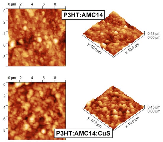 Based on the AFM images recorded on the MAPLE deposited mixed layers (Figure 6), the roughness parameters (root mean square—RMS/roughness average—Ra) were assessed at 58 nm/45 nm for P3HT:AMC14 organic film and 58 nm/46 nm for P3HT:AMC14:CuS composite film. As can be remarked, both types of samples present the same RMS values (58 nm) and very close Ra values (45 and 46 nm, respectively). Thus, the estimated values suggest that the influence of the CuS nanoparticles embedded in the organic blend is negligible in respect to the arrangement of the organic molecules on the substrate surface. A similar result obtained for the MAPLE hybrid coatings based on CoPc:C60:ZnO [65] emphasizes that the addition of a small amount of inorganic nanoparticles into an organic matrix does not affect the roughness parameters.