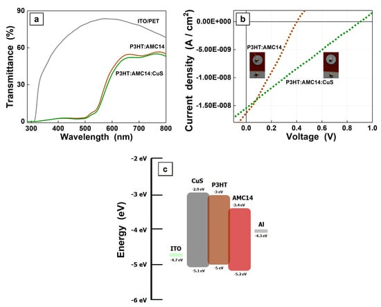 The UV–Vis spectra of the organic and hybrid active films obtained by MAPLE on ITO/PET flexible substrates, the J-V characteristics plotted under illumination for the heterostructures containing MAPLE deposited layers and the schematic energy level diagram of the compounds used in their fabrication were presented in Figure 7. In the UV–Vis spectra of the MAPLE films deposited on ITO/PET (Figure 7a), the typical absorption bands of the acceptor compound (AMC14) can be identified. In addition, it can be noted the impact of the substrate transmittance on the optical properties of the mixed films taken into consideration that the layers were prepared on both substrates, glass (Figure 4a) and ITO/PET (Figure 7a) in the same experimental cycle. In terms of electrical performances, both heterostructures present photovoltaic effect (Figure 7b). The highest occupied molecular orbital (HOMO) and the lowest unoccupied molecular orbital (LUMO) levels of the third component (CuS) should be positioned between the main donor (P3HT) and acceptor (AMC14) in order to achieve a cascade energy level configuration, as can be seen in the schematic energy level diagram of all compounds from the investigated structure (Figure 7c).