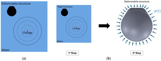 - Löhner, R.; Li, L.; Soto, O.A.; Baum, J.D. An arbitrary Lagrangian–Eulerian method for fluid–structure interactions due to underwater explosions. Int. J. Numer. Methods Heat Fluid Flow 2023, 33, 2308–2349. [Google Scholar] [CrossRef]