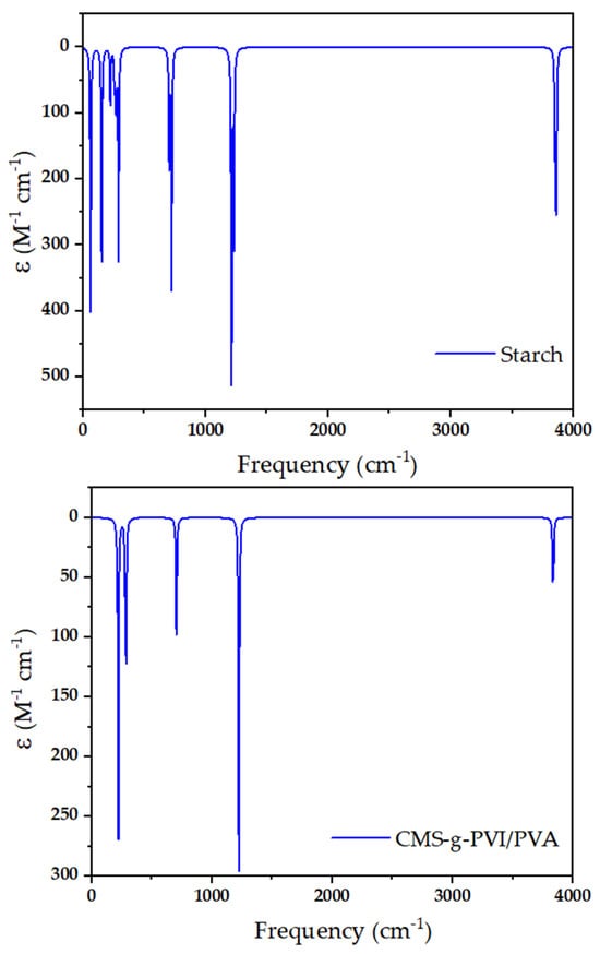 To determine the most efficient and reliable predictive method for the study of molecular characteristics, a simulation of starch and the CMS, CMS-g-PVI, and CMS-g-PVI/PVA systems was performed. In this research, different theoretical levels were used, selected with the aim of balancing the accuracy of the results with the computational cost linked to each calculation.