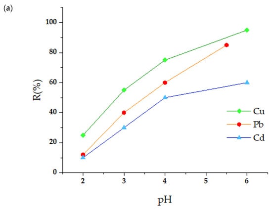 The pH of the solution is a determining factor in the efficiency of the adsorption process since it modulates the speciation of the metal ions, the surface charge of the adsorbent, and the degree of ionization of the functional groups responsible for the interaction with the contaminants. Figure 4a,b illustrate how the adsorption capacity of the m-CVP beads varies as a function of pH.